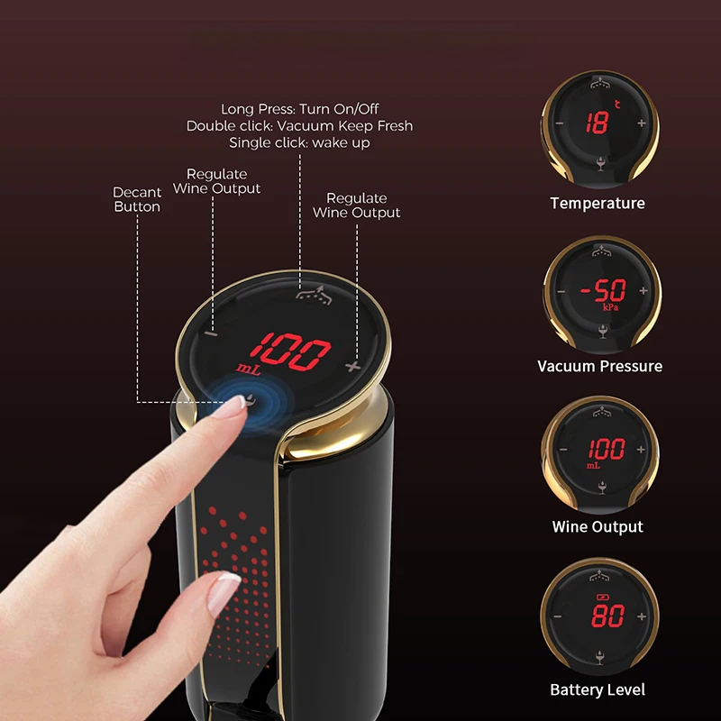 El dispensador inteligente que transforma tu forma de disfrutar el vino. Oxigena al instante, preserva la frescura hasta 30 días y sirve cada copa con precisión gracias a su pantalla LED táctil. Diseño premium, perfecto para amantes del vino y como regalo exclusivo.