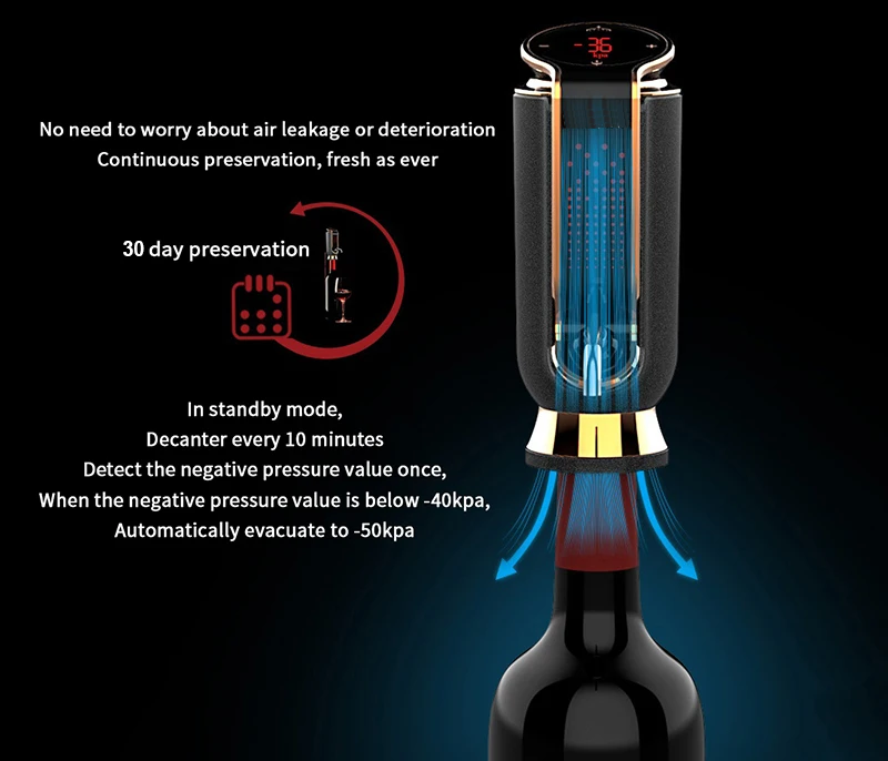 Mantiene el vino fresco y aromático hasta 30 días, evitando la oxidación con su sistema de control de presión al vacío.